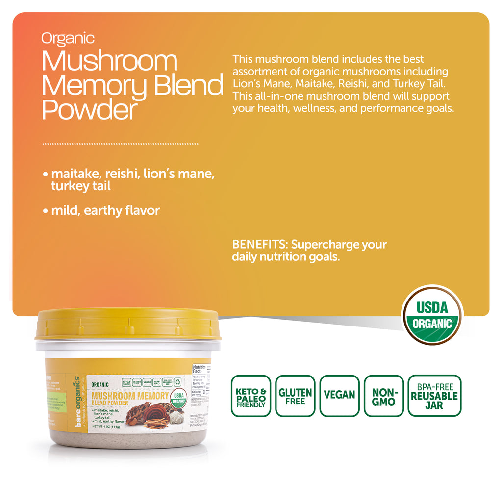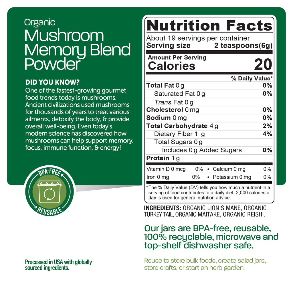 Proprietary Blend: Organic Oyster Mushroom, Organic Lion's Mane, Organic Turkey Tail, Organic Chaga, Organic Maitake Mushroom, Organic Red Reishi.
